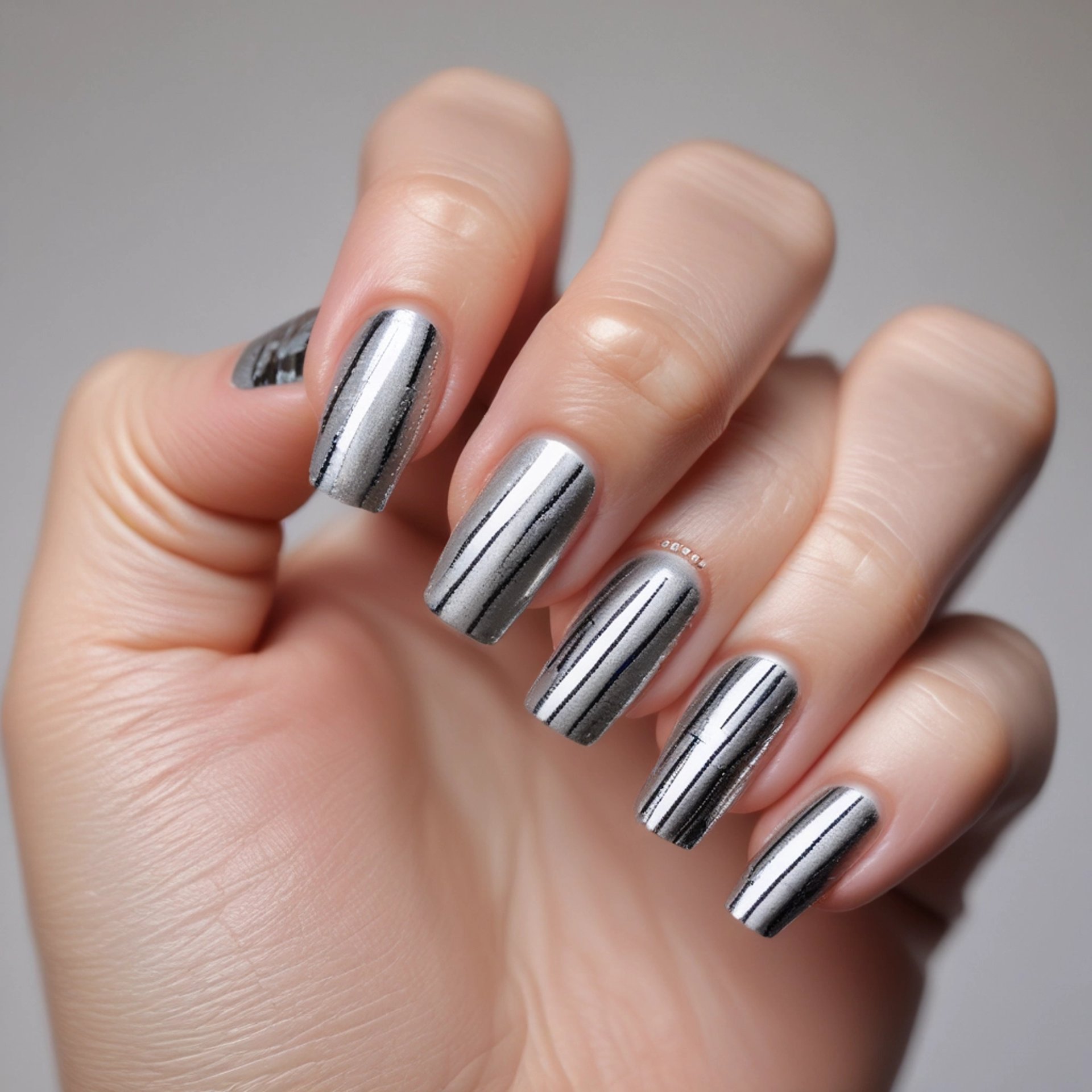 What You'll Need: Beige or light gray base, black polish, white polish, and silver chrome powder.