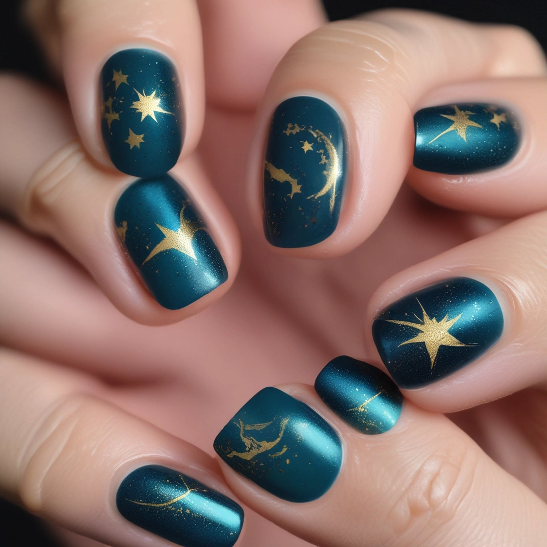 What You'll Need: Deep midnight purple or teal polish, metallic gold foil/flakes, and tiny crescent moon or star decals.