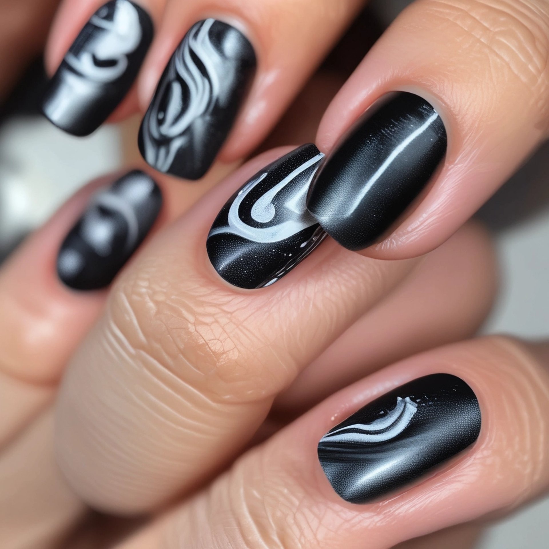 The Swirl: Apply a layer of sheer top coat (don't cure!). Use a fine brush to swirl tiny amounts of gray/white and black gel into the wet top coat. Tip: You can lightly dab the brush with alcohol for a more hazy, diffused look.